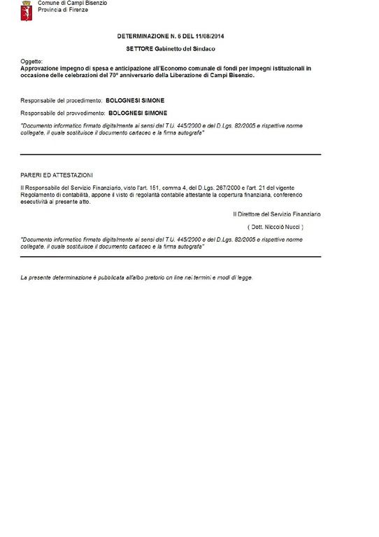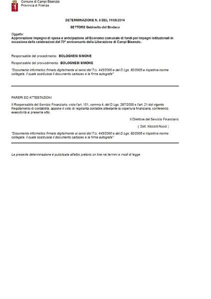 Comune di Campi Bisenzio - DETERMINAZIONE N. 6 DEL 2014-08-11 - Approvazione impegno di spesa e anticipazione all’Economo comunale di fondi per impegni istituzionali in occasione delle celebrazioni del 70° anniversario della Liberazione di Campi Bisenzio.
