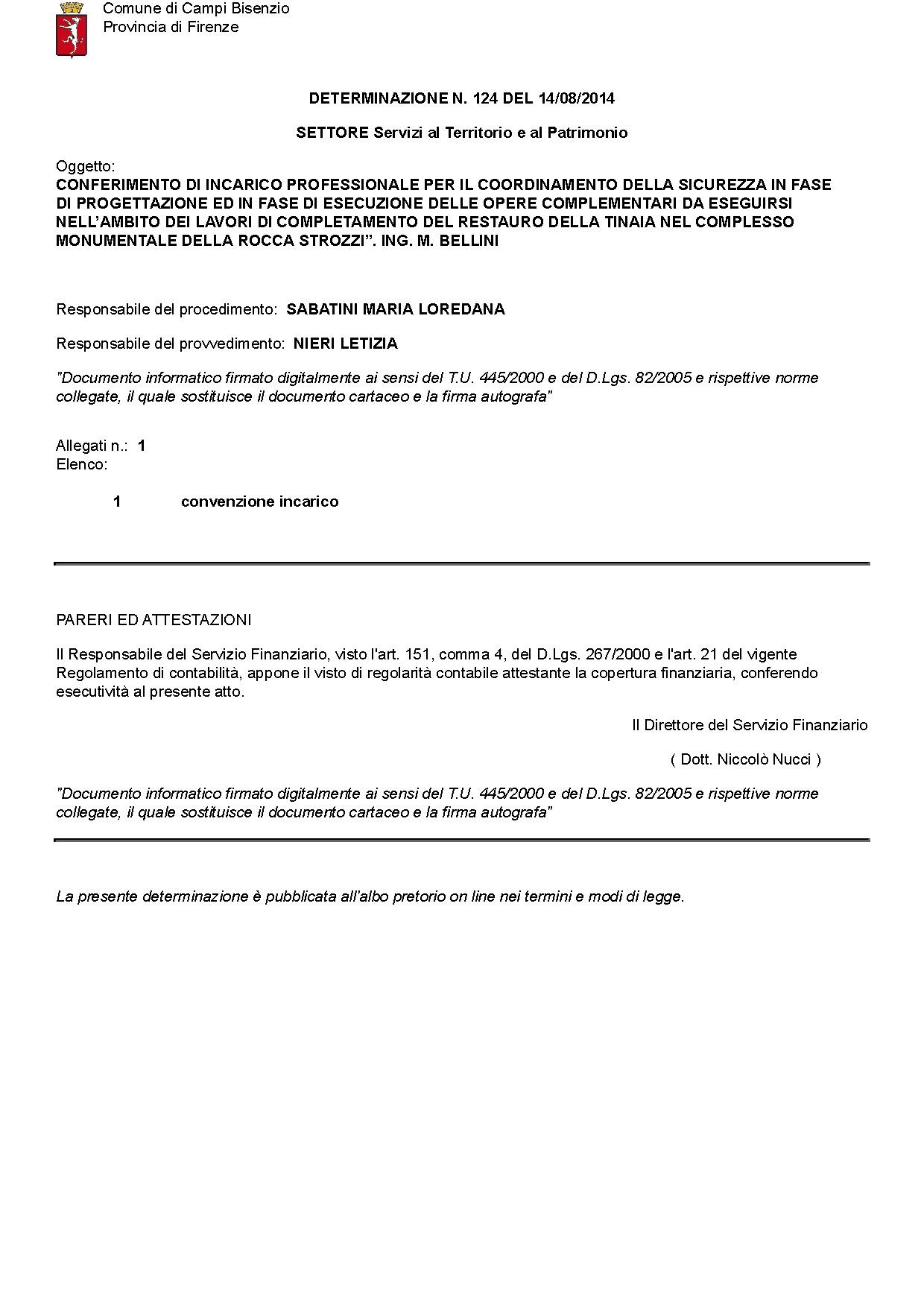 Comune di Campi Bisenzio - DETERMINAZIONE N. 124 DEL 2014-08-14 - CONFERIMENTO DI INCARICO PROFESSIONALE PER IL COORDINAMENTO DELLA SICUREZZA IN FASE DI PROGETTAZIONE ED IN FASE DI ESECUZIONE DELLE OPERE COMPLEMENTARI DA ESEGUIRSI NELL’AMBITO DEI LAVORI DI COMPLETAMENTO DEL RESTAURO DELLA TINAIA NEL COMPLESSO MONUMENTALE DELLA ROCCA STROZZI”. ING. M. BELLINI