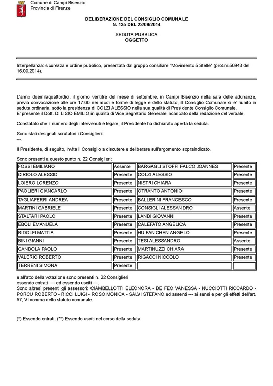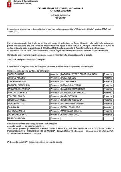 Comune di Campi Bisenzio - DELIBERAZIONE N. 135 DEL 2014-09-23 - Interpellanza: sicurezza e ordine pubblico, presentata dal gruppo consiliare "Movimento 5 Stelle" (prot.nr.50943 del 16.09.2014).