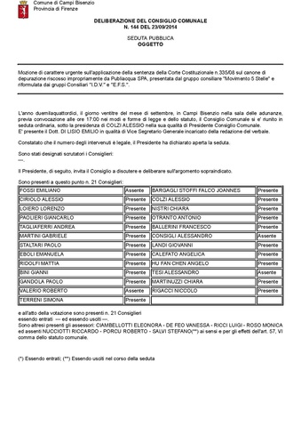 Comune di Campi Bisenzio - DELIBERAZIONE N. 144 DEL 2014-09-23 - Mozione di carattere urgente sull'applicazione della sentenza della Corte Costituzionale n.335/08 sul canone di depurazione riscosso impropriamente da Publiacqua SPA, presentata dal gruppo consiliare "Movimento 5 Stelle" e riformulata dai gruppi Consiliari "I.D.V." e "E.F.S.".