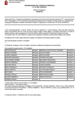 Comune di Campi Bisenzio - DELIBERAZIONE N. 147 DEL 2014-09-23 - Ordine del Giorno: richiesta di presentazione osservazioni dal Comune di Campi alla variante al P.I.T. comprensiva del Piano Paesaggistico contro l'ipotesi del potenziamento dell'aeroporto di Peretola "Amerigo Vespucci", presentata dal capogruppo del gruppo consiliare "Movimento 5 Stelle" N. Rigacci(prot.nr.44242 del 31.07.2014). RESPINTO.