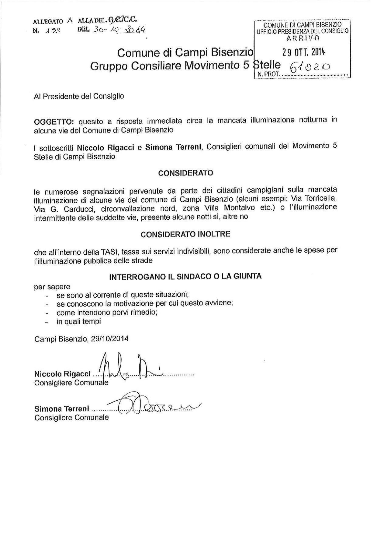 Campi Bisenzio - Consiglio Comunale del 30 ottobre 2014 - Quesiti a risposta immediata