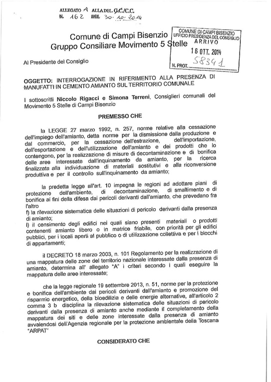 Interrogazione in riferimento alla presenza di manufatti in cemento amianto sul territorio comunale, presentata dal gruppo consiliare "Movimento 5 Stelle" (prot.nr.58341 del 16.10.2014).