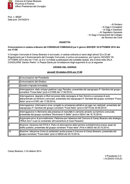 Comune di Campi Bisenzio - Convocazione in seduta ordinaria del CONSIGLIO COMUNALE per il giorno GIOVEDI' 30 OTTOBRE 2014 alle ore 17:00