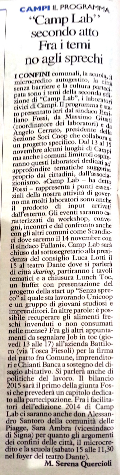 "Camp Lab" secondo atto Fra i temi no agli sprechi - La Nazione - 6 novembre 2014