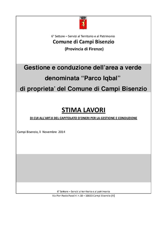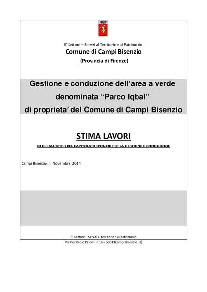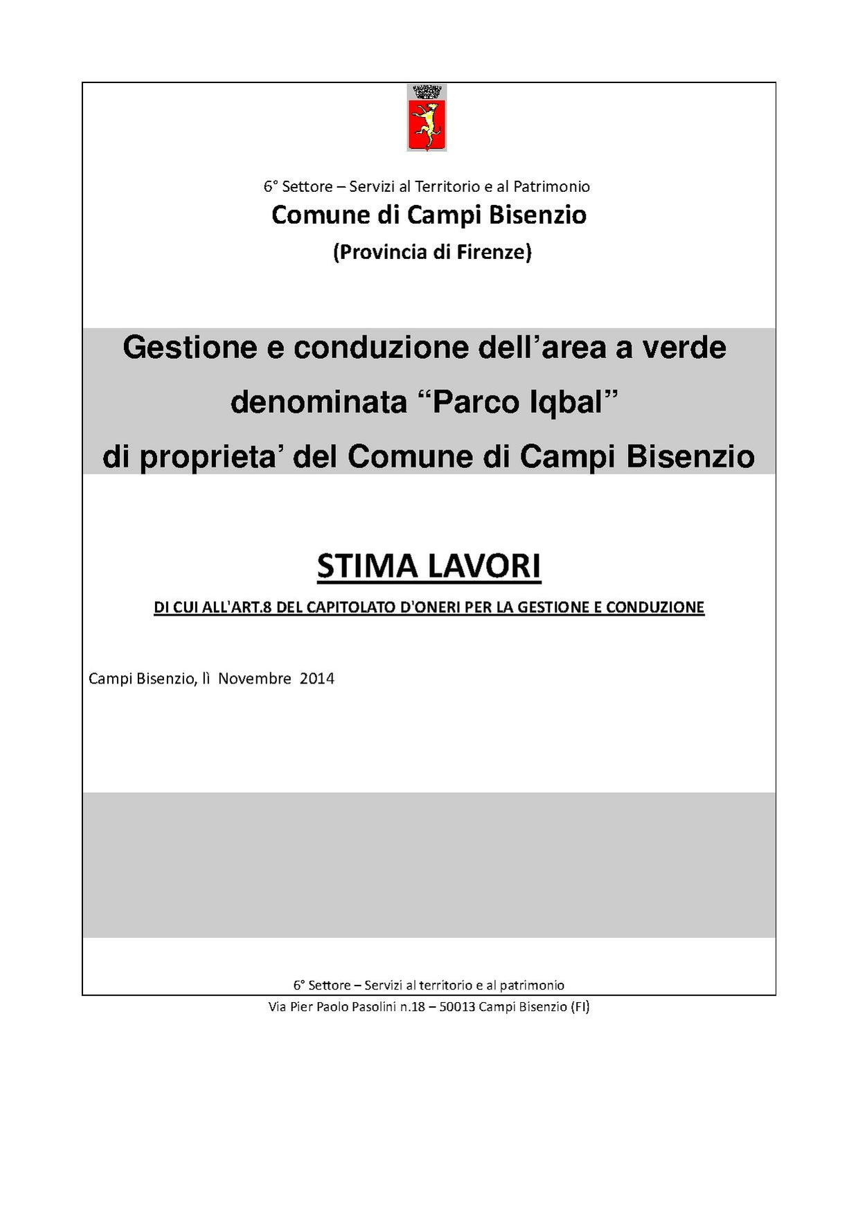 Gestione e conduzione dell’area a verde denominata “Parco Iqbal” di proprieta’ del Comune di Campi Bisenzio - STIMA LAVORI - DI CUI ALL'ART.8 DEL CAPITOLATO D'ONERI PER LA GESTIONE E CONDUZIONE