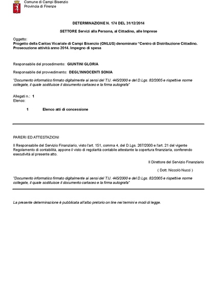 Comune di Campi Bisenzio - DETERMINAZIONE N. 174 DEL 2014-12-31 - Progetto della Caritas Vicariale di Campi Bisenzio (ONLUS) denominato “Centro di Distribuzione Cittadino. Prosecuzione attività anno 2014. Impegno di spesa