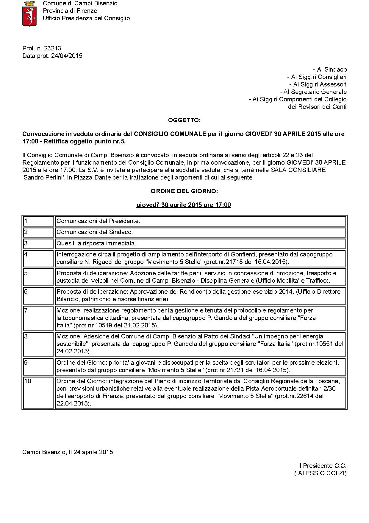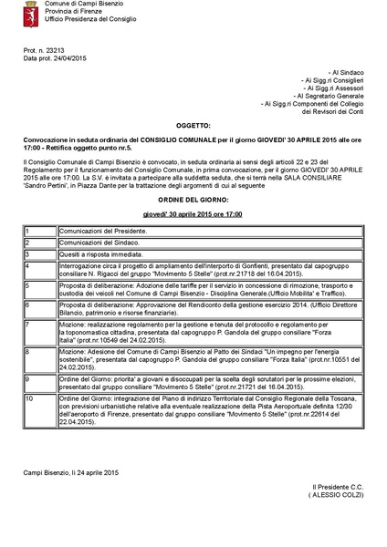 Comune di Campi Bisenzio - Convocazione in seduta ordinaria del CONSIGLIO COMUNALE per il giorno GIOVEDI' 30 APRILE 2015 alle ore 17:00 - Ordine del Giorno