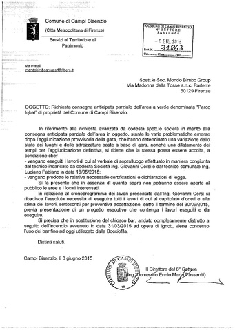 Richiesta consegna anticipata parziale dell'area a verde denominata "Parco Iqbal" di proprietà del Comune di Campi Bisenzio.