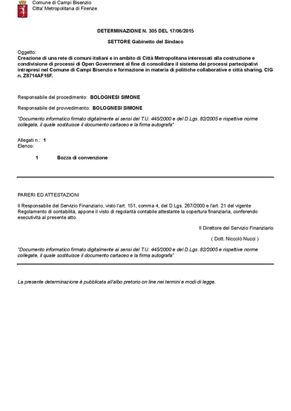 Comune di Campi Bisenzio - DETERMINAZIONE N. 305 DEL 2015-06-17 - Creazione di una rete di comuni italiani e in ambito di Citta Metropolitana interessati alla costruzione e condivisione di processi di Open Government al fine di consolidare il sistema dei processi partecipativi intrapresi nel Comune di Campi Bisenzio e formazione in materia di politiche collaborative e citta sharing. CIG n. Z8714AF16F.