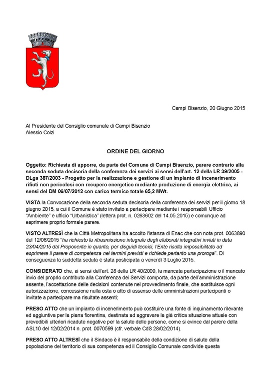 Consiglio comunale Campi Bisenzio - Ordine del Giorno - Richiesta di apporre, da parte del Comune di Campi Bisenzio, parere contrario alla seconda seduta decisoria della conferenza dei servizi ai sensi dell’art. 12 della LR 39/2005 - DLgs 387/2003 - Progetto per la realizzazione e gestione di un impianto di incenerimento rifiuti non pericolosi con recupero energetico mediante produzione di energia elettrica, ai sensi del DM 06/07/2012 con carico termico totale 65,2 MWt. - 30 giugno 2015