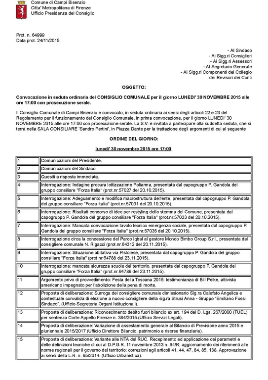 Comune di Campi Bisenzio - Convocazione in seduta ordinaria del CONSIGLIO COMUNALE per il giorno LUNEDI' 30 NOVEMBRE 2015 alle ore 17:00 con prosecuzione serale.