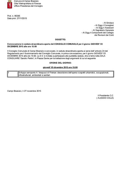 Comune di Campi Bisenzio - Convocazione in seduta straordinaria aperta del CONSIGLIO COMUNALE per il giorno GIOVEDI' 03 DICEMBRE 2015 alle ore 15:00 - Sviluppo aeroporto A. Vespucci di Firenze: descrizione dell'opera e aspetti urbanistici, occupazionali, infrastrutturali, ambientali e sanitari.