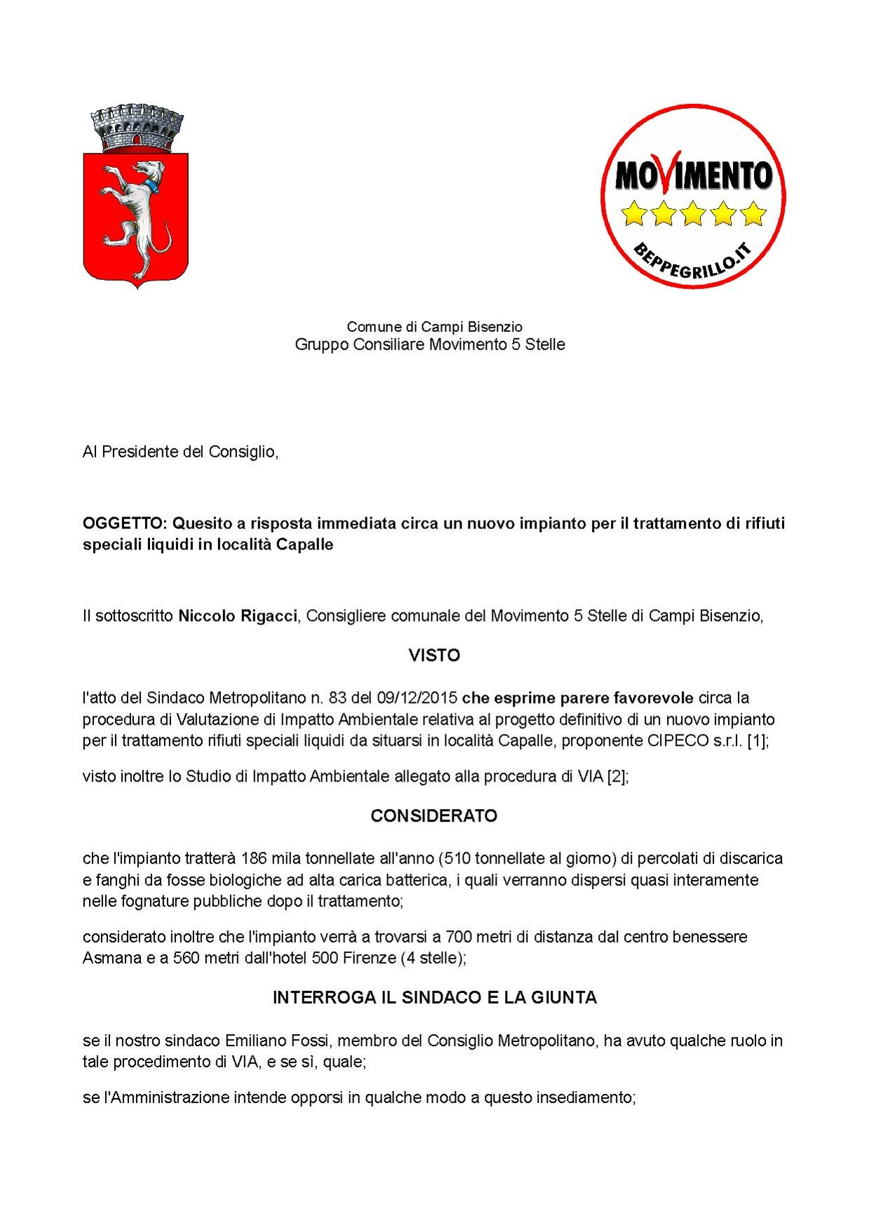 Quesito a risposta immediata circa un nuovo impianto per il trattamento di rifiuti speciali liquidi in località Capalle