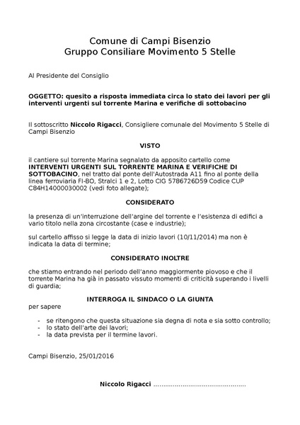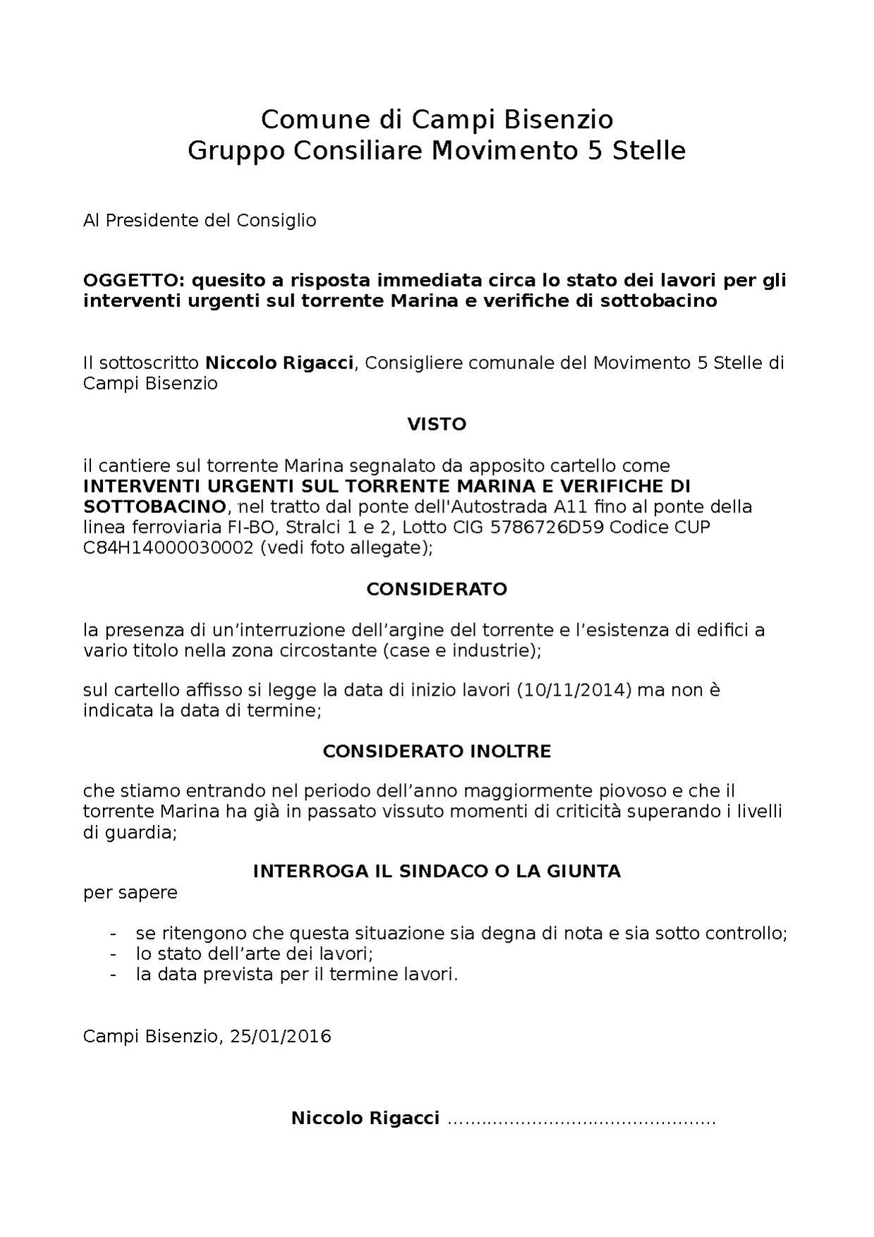 Quesito a risposta immediata circa lo stato dei lavori per gli interventi urgenti sul torrente Marina e verifiche di sottobacino - Consiglio comunale 26 gennaio 2016.