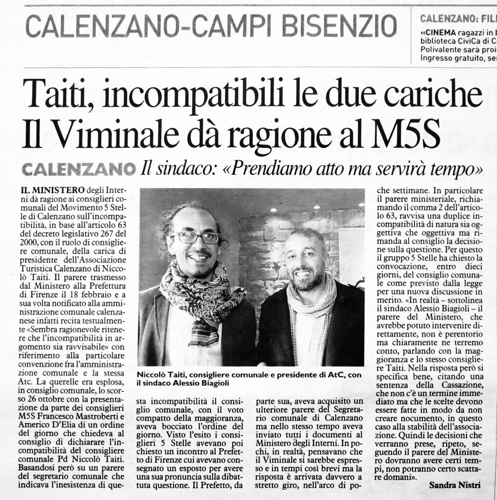 Taiti, incompatibili le due cariche - Il Viminale dà ragione al M5S - La Nazione, 20 febbraio 2016