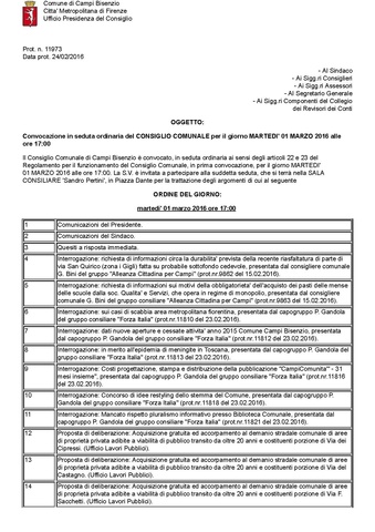Convocazione in seduta ordinaria del CONSIGLIO COMUNALE per il giorno MARTEDI' 01 MARZO 2016 alle ore 17:00 - ORDINE DEL GIORNO