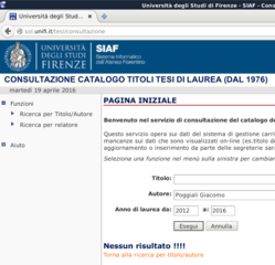 Screenshot dal sito dell'Università di Firenze, servizio ricerca tesi di laurea - 19 aprile 2016.