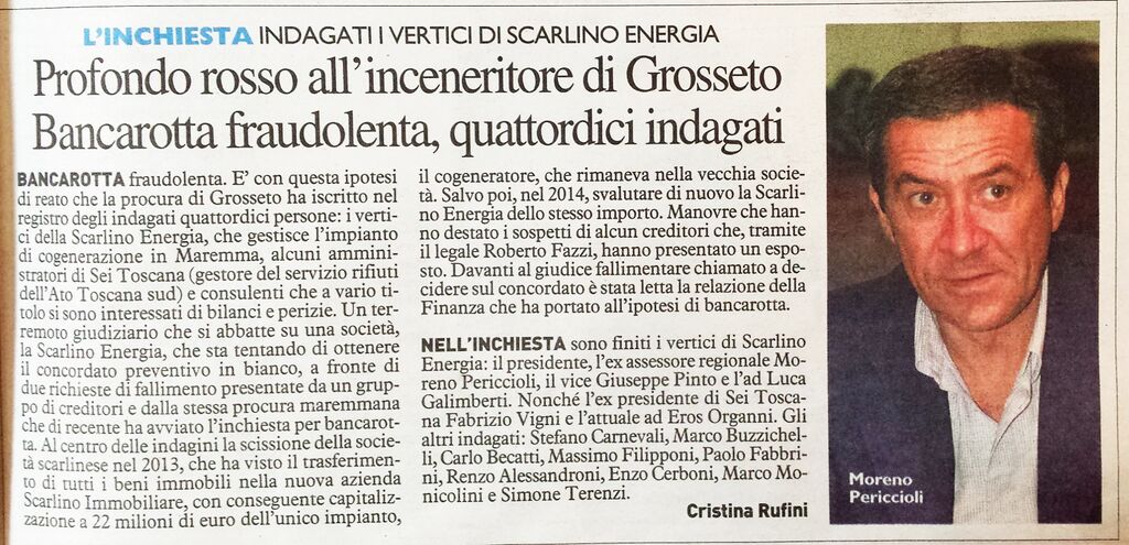 Profondo rosso all'inceneritore di Grosseto - Bancarotta fraudolenta, quattordici indagati - La Nazione - 10 giugno 2016