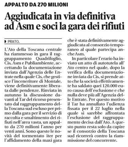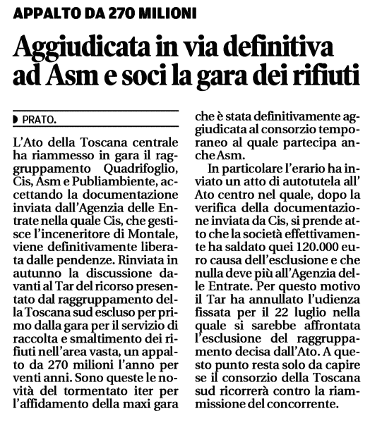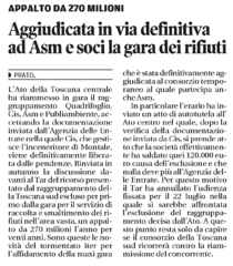 Aggiudicato in via definitiva ad ASM e soci la gara dei rifiuti - Il Tirreno, 17 luglio 2016 - Edizione Prato Pistoia Montecatini, pag. XV