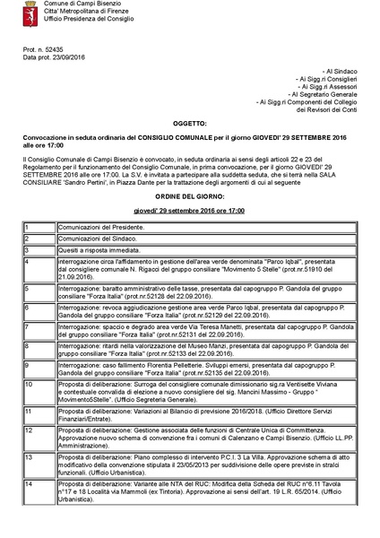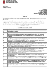 Convocazione in seduta ordinaria del CONSIGLIO COMUNALE per il giorno GIOVEDI' 29 SETTEMBRE 2016 alle ore 17:00 - ORDINE DEL GIORNO:
