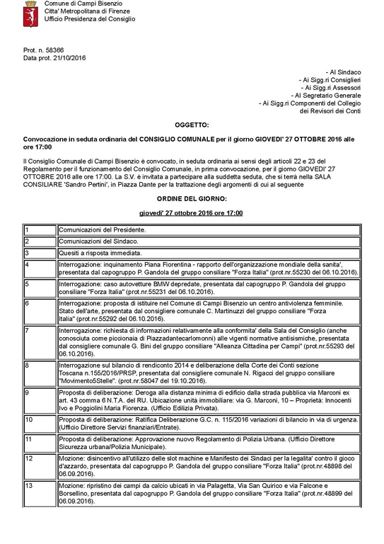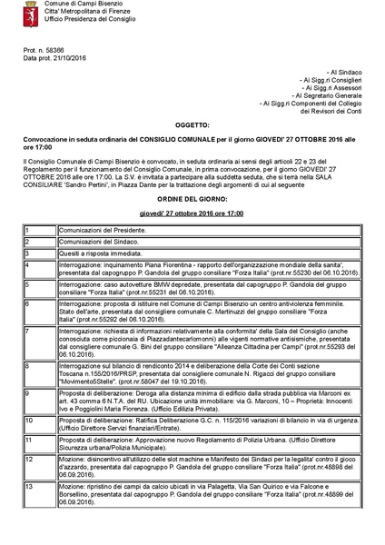 Consiglio Comunale di Campi Bisenzio - Convocazione in seduta ordinaria del CONSIGLIO COMUNALE per il giorno GIOVEDI' 27 OTTOBRE 2016 alle ore 17:00 - ORDINE DEL GIORNO
