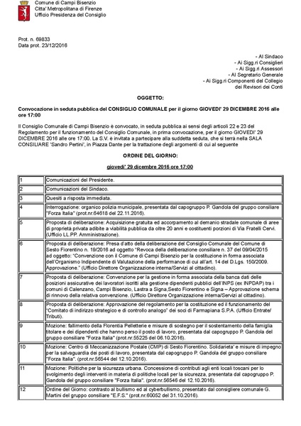 Convocazione in seduta pubblica del CONSIGLIO COMUNALE per il giorno GIOVEDI' 29 DICEMBRE 2016 alle ore 17:00 - ORDINE DEL GIORNO