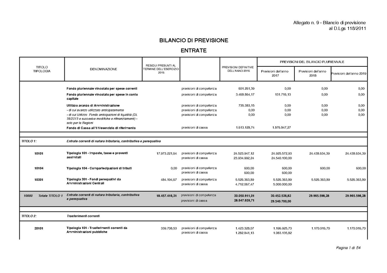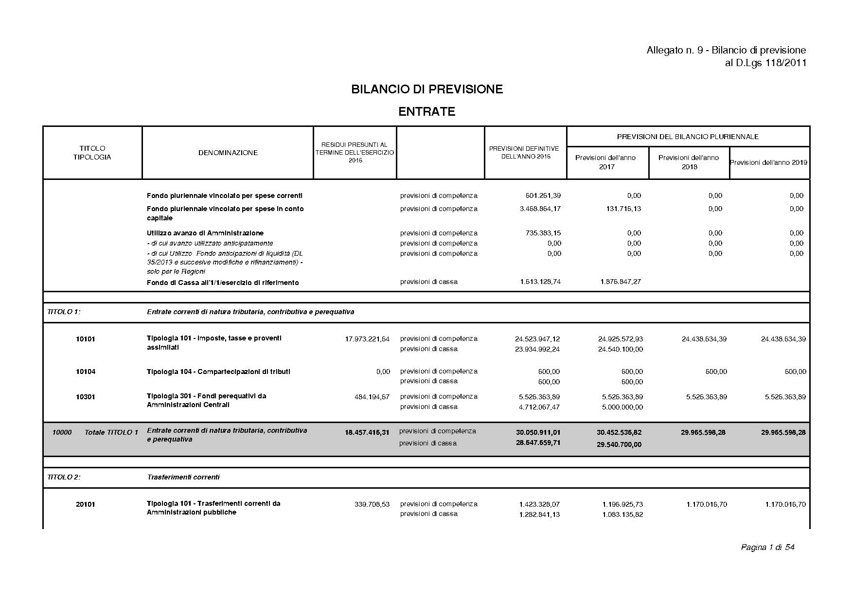BILANCIO DI PREVISIONE ENTRATE / SPESE Allegato n. 9 − Bilancio di previsione al D.Lgs 118/2011