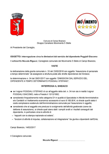 Interrogazione circa le dimissioni dal servizio del dipendente Poggiali Giacomo - 21 febbraio 2017