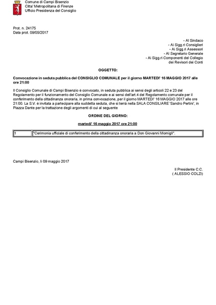 Il Consiglio Comunale di Campi Bisenzio è convocato per il giorno MARTEDI' 16 MAGGIO 2017 alle ore 21:00 - ORDINE DEL GIORNO