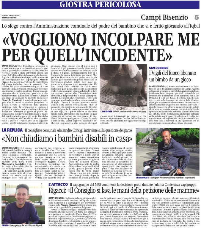 Giostra pericolosa - Vogliono incolpare me per quell'incidente - Non chiudiamo i bambini disabili in casa - Rigacci: "Il Consiglio si lava le mani della petizione delle mamme" - Bisenziosette, 4 agosto 2017