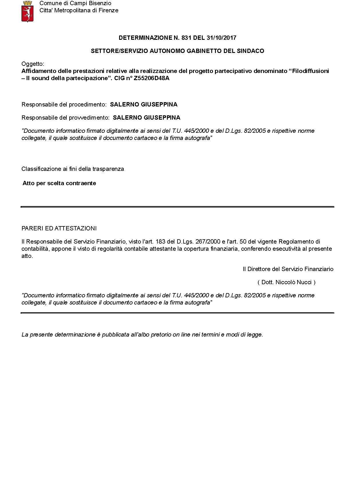 Comune di Campi Bisenzio - DETERMINAZIONE N. 831 DEL 2017-10-31 - Affidamento delle prestazioni relative alla realizzazione del progetto partecipativo denominato ?Filodiffusioni ? Il sound della partecipazione?. CIG n? Z55206D48A