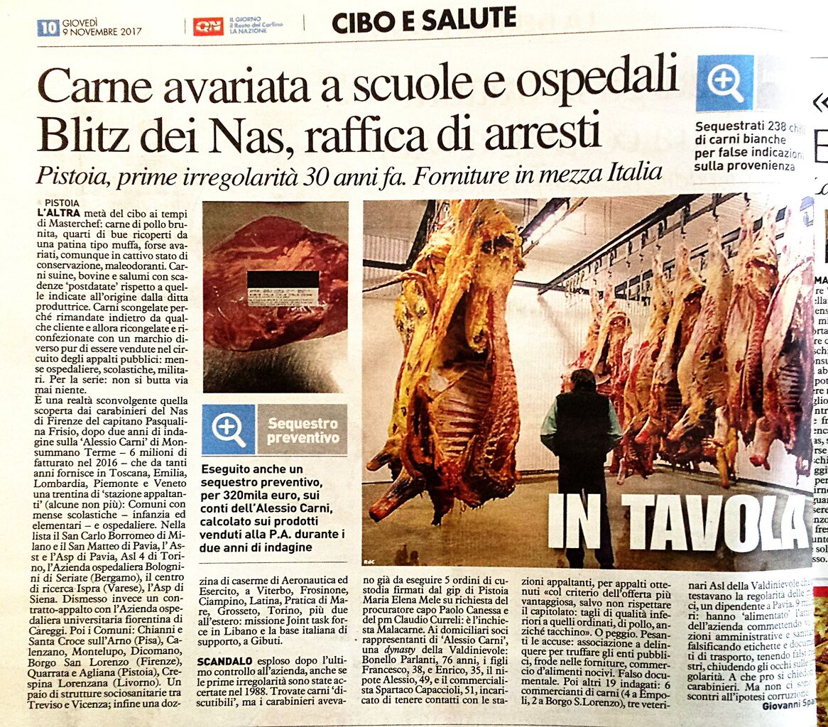 Carne avariata a scuole e ospedali - Blitz dei Nas, raffica di arresti - La Nazione, 9 novembre 2017