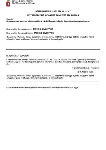 Comune di Campi Bisenzio - DETERMINAZIONE N. 873 DEL 2017-11-10 - Organizzazione seconda edizione del Festival dell?Economia Civile. Assunzione impegno di spesa.