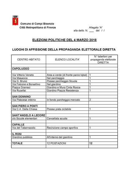 ELEZIONI POLITICHE DEL 4 MARZO 2018 - LUOGHI DI AFFISSIONE DELLA PROPAGANDA ELETTORALE DIRETTA