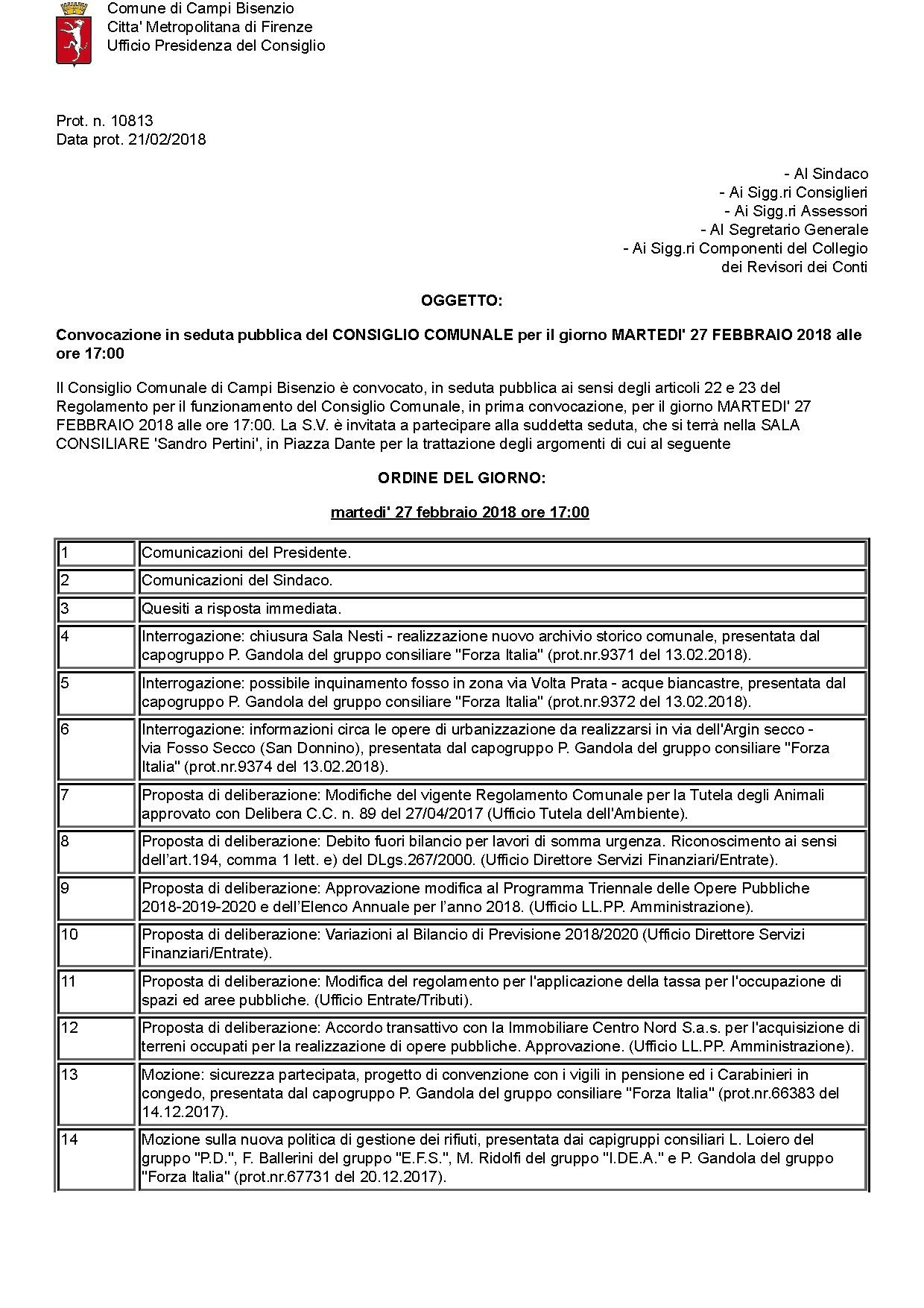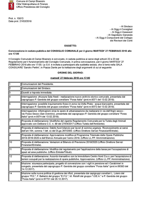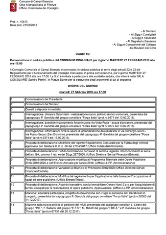 Comune di Campi Bisenzio - Convocazione in seduta pubblica del CONSIGLIO COMUNALE per il giorno MARTEDI' 27 FEBBRAIO 2018 alle ore 17:00 - ORDINE DEL GIORNO
