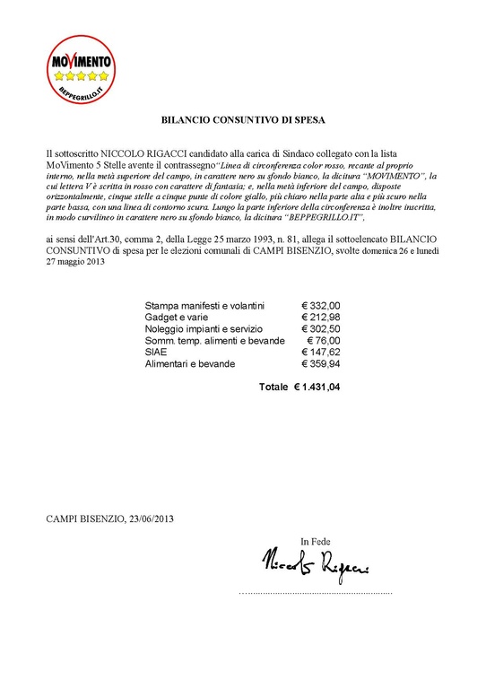 Bilancio consuntivo di spesa per campagna elettorale Amministrative 2013. Candidato sindaco.