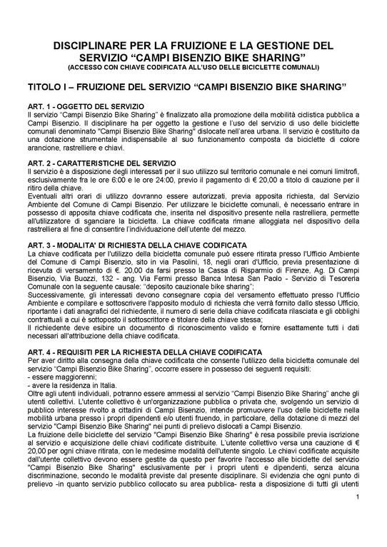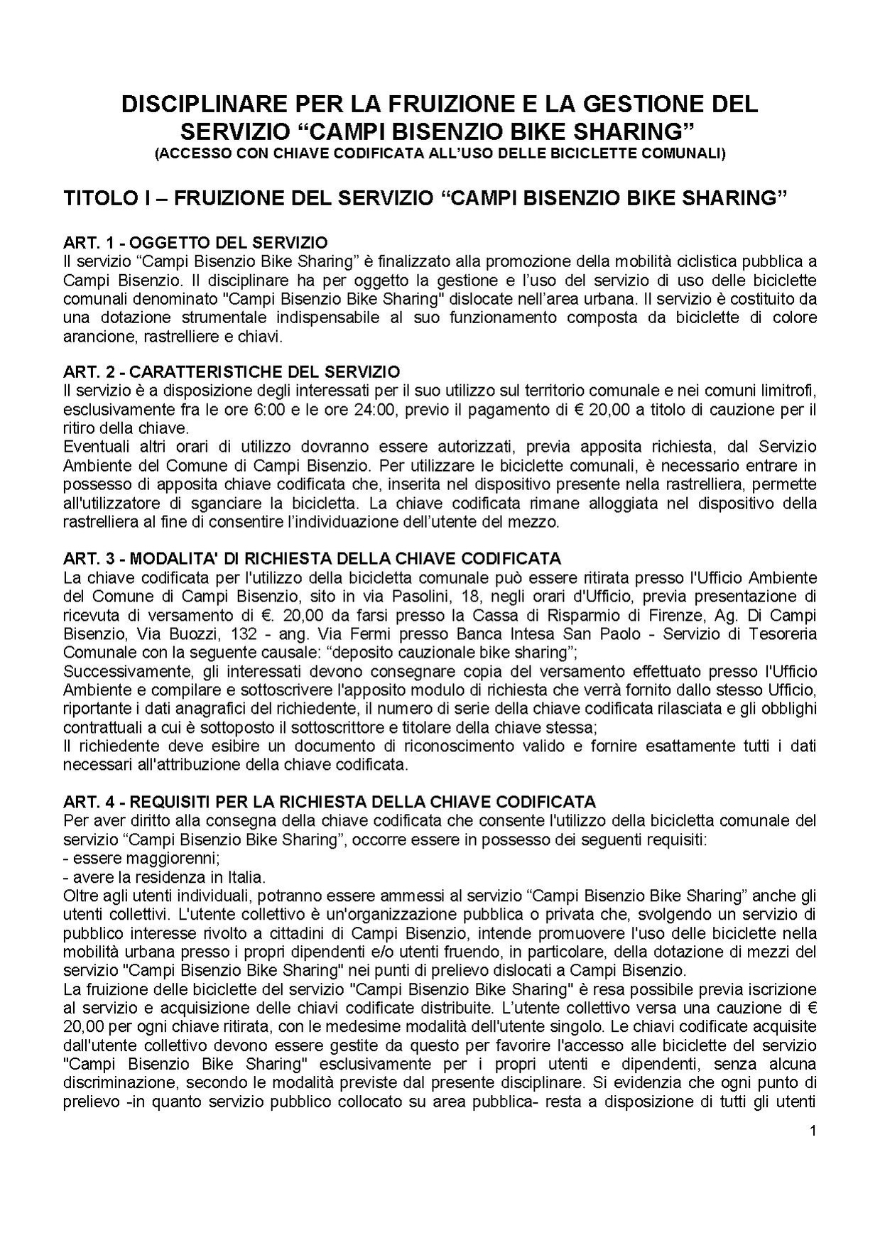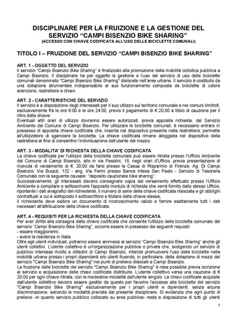 DISCIPLINARE PER LA FRUIZIONE E LA GESTIONE DEL SERVIZIO “CAMPI BISENZIO BIKE SHARING” (ACCESSO CON CHIAVE CODIFICATA ALL’USO DELLE BICICLETTE COMUNALI) - http://www.comune.campi-bisenzio.fi.it/flex/cm/pages/ServeAttachment.php/L/IT/D/7%252F5%252F2%252FD.eeef7d9385ff693c18f9/P/BLOB%3AID%3D6918