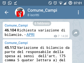 Tramite un canale Telegram vengono rilanciate le delibere di Giunta e di Consiglio, nonché le determine dei vari settori (che sono la fonte indispensabile a conoscere gli importi di spesa).