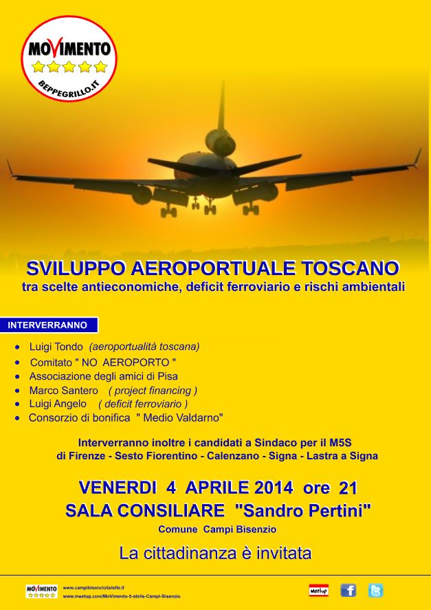 screenIl M5S di Campi Bisenzio organizza un incontro sul tema  aeroportualità toscana, in particolare tratterà le varie problematiche di carattere economico, logistico  e ambientale legate all’ampliamento dell’aeroporto di Firenze “Amerigo Vespucci” . Anche l’aeroporto di Pisa “Galileo Galilei” entra a pieno titolo nel progetto, con la creazione di una Holding a gestione integrata. Scelte dettate da strategie di business che non tengono conto dei costi abnormi dell’operazione che in parte ricadrebbe sulle spalle dei cittadini, della scarsa produzione di posti di lavoro e dei possibili danni ambientali che ne deriverebbero. Il M5S è da sempre contrario a questo progetto , proponendo in alternativa un incremento della rete ferroviaria con lo scalo pisano, salvaguardando l’ambiente e la salute dei cittadini che vivono nella Piana.